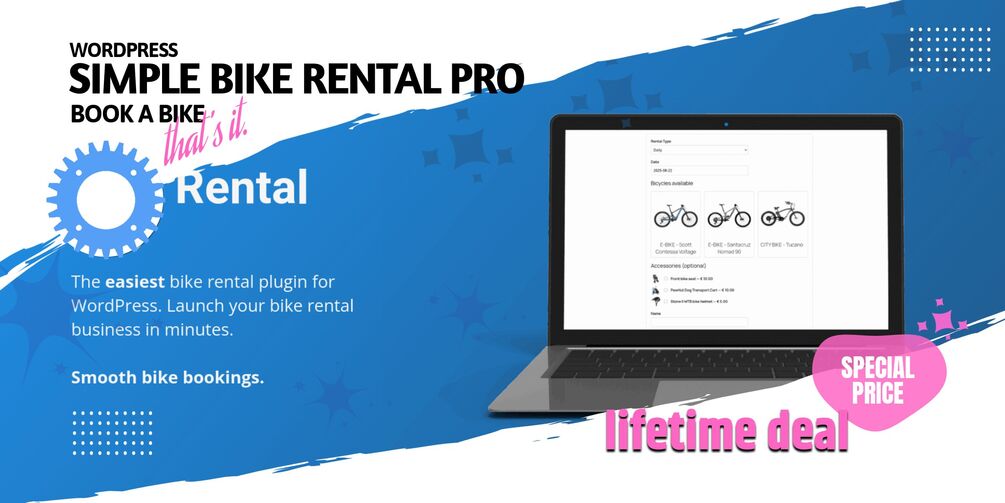 Simple Bike Rental Pro is a lightweight and flexible WordPress plugin that lets you offer bike rental bookings directly from your website – with or without online payments via Stripe.